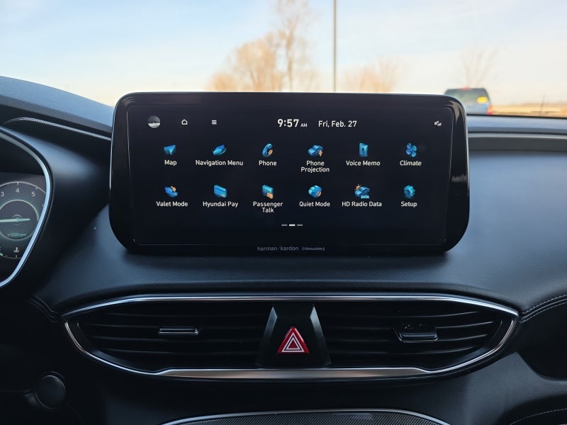 - Radio: AM/FM Harman Kardon Display Audio -inc: 10.25" display screen, Apple CarPlay and Android Auto, Bluetooth® hands-free w/wireless audio streaming, steering wheel audio and phone controls, dual front USB ports, SiriusXM, HD Radio, Blue Link connected car system, 12 speakers including subwoofer, external amplifier, Clari-Fi music restoration technology, QuantumLogic surround, navigation system w/traffic flow including incident data via HD Radio (HERE), rear seat quiet mode and wireless device charging